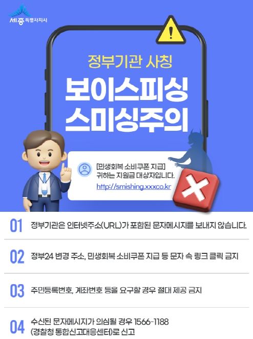 (중부시사신문) 세종특별자치시가 국가정보자원관리원 화재로 인한 전산시스템 복구 기간 전화나 문자메시지로 대체사이트 접속, 앱 재설치 등을 유도하는 범행이 우려됨에 따라 각별한 주의를 당부했다.