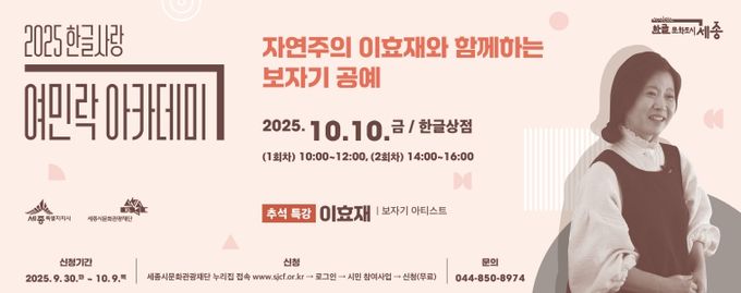 이번 강좌는 추석 연휴를 맞아 시민들이 한글과 전통 공예를 체험할 수 있도록 기획됐으며, ‘자연주의 이효재와 함께하는 보자기 공예’를 주제로 진행한다. 강좌를 이끄는 이효재 대표(효재네뜰)는 2017년 한국직업능력개발원 전통생활문화 부문 명인으로 선정됐으며, 2017 한중국제영화제 문화위원장을 역임한 바 있다. 또한, '굿모닝 대한민국', '학교 요리왕', '효재의 정원' 등 다수의 방송에 출연하고, '효재의 살림풍류' 등의 저서를 집필하며 전통 문화의 아름다움을 알리고 있다.