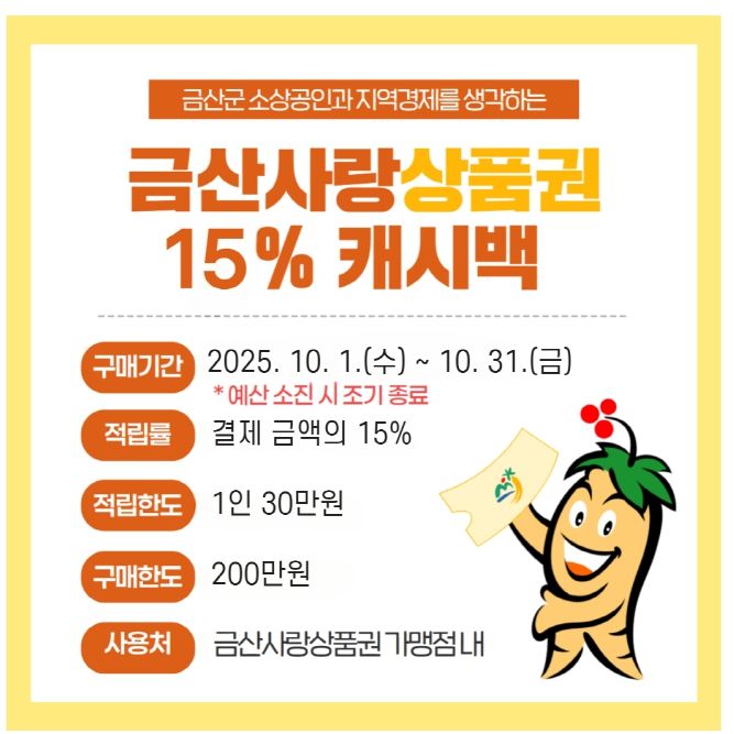 (중부시사신문) 금산군은 지역 상권에 활기를 불어넣기 위해 9월부터 적용한 금산사랑상품권 캐시백 적립률 15%를 10월에도 유지한다.