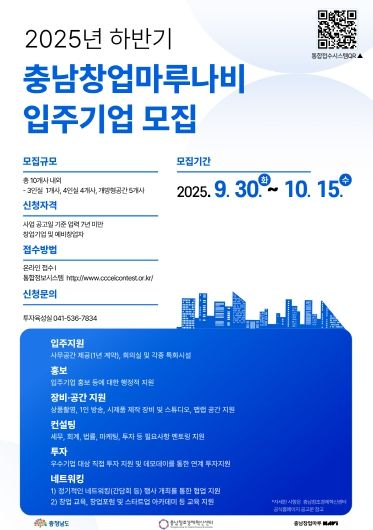 (중부시사신문) (재)충남창조경제혁신센터는 오는 10월 15일까지 2025년 하반기 충남창업마루나비 입주기업을 모집한다고 밝혔다. 이번 모집은 혁신적인 아이디어와 성장 잠재력을 지닌 스타트업을 발굴해 안정적인 보육 환경을 제공하고, 기업의 지속적인 성장을 지원하기 위해 추진된다.