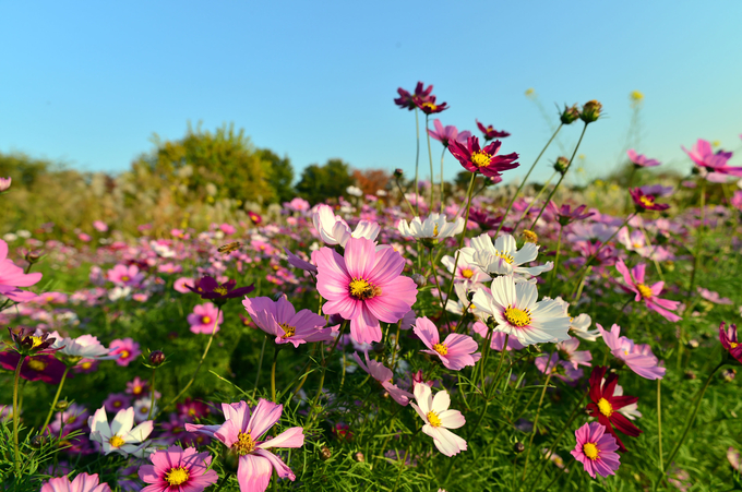 이곳 코스모스 길은 분홍, 아이보리, 자주 등 다양한 색깔의 꽃물결을 이뤄 파란 가을하늘 속 아름다운 풍경을 연출하고 있다.