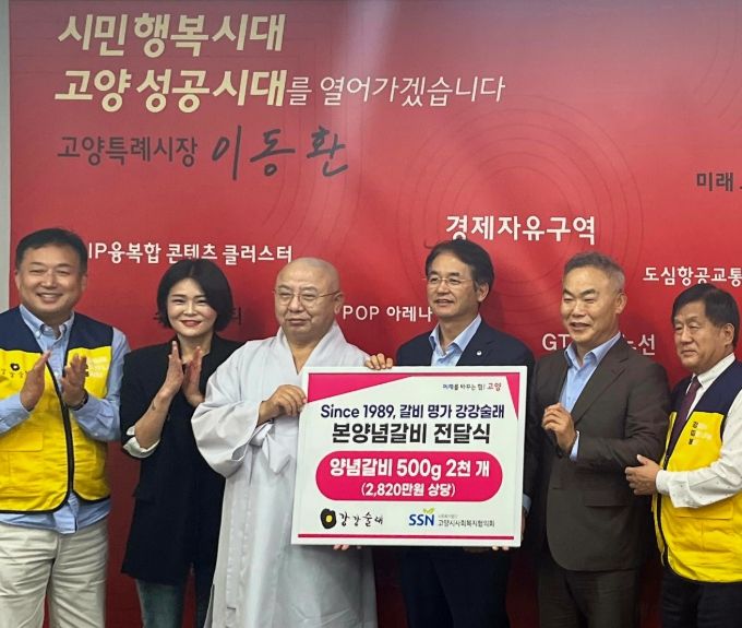 (중부시사신문) ㈜전한의 외식브랜드 강강술래(대표 노상환)가 10월 10일, 고양특례시에 본양념갈비 500g 2,000개(2,820만 원 상당)를 기탁했다. 이번 전달식은 고양특례시청 열린시장실에서 진행됐으며, 이동환 고양특례시장, 김민숙 고양특례시의원(고양, 관산, 원신), 노상환 강강술래 대표, 김응화 고양시사회복지협의회 회장이 함께 자리했다.