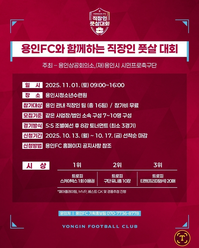 용인시 관내 사업장에서 근무하는 직장인이라면 누구나 참여할 수 있으며, 총 16개 팀이 출전해 조별리그와 토너먼트 방식으로 우승을 가린다. 참가 선수 전원에게는 기념품이 제공되며, 우승·준우승·3위 팀은 물론 페어플레이팀, MVP, 베스트GK에게도 특별 시상품이 수여된다. 또한 현장에서는 경품 추첨 이벤트도 진행된다. 대회 참가비는 무료이며, 구단 홈페이지를 통해 신청할 수 있다.
