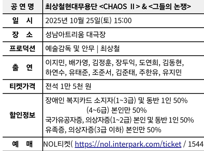 성남문화재단(대표이사 윤정국)은 ‘(재)예술경영지원센터 2025 공연예술 지역 유통지원사업 선정작’으로 최상철현대무용단의 ‘CHAOS Ⅱ’와 ‘그들의 논쟁’을 오는 10월 25일(토) 오후 3시 성남아트리움 대극장에서 선보인다.
