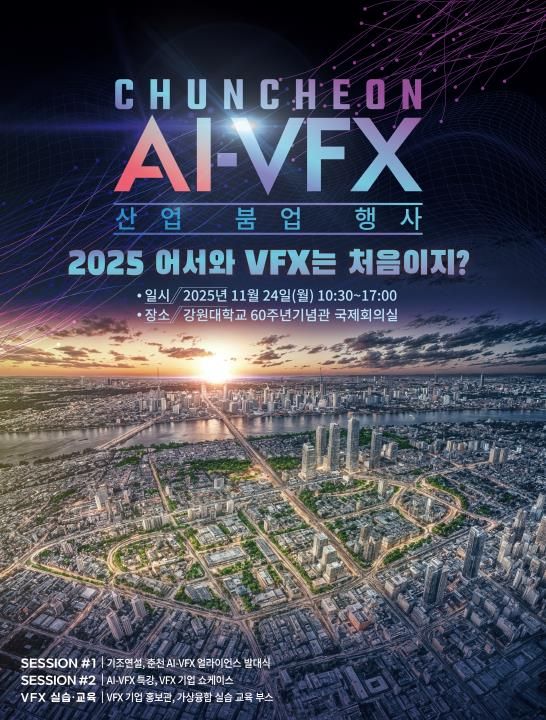 (중부시사신문) 춘천시는 2025년 11월 24일 강원대학교 60주년 기념관 국제 회의실에서 ‘춘천 AI-VFX 산업붐업행사 – 2025 어서와! VFX는 처음이지?’를 개최한다고 밝혔다.