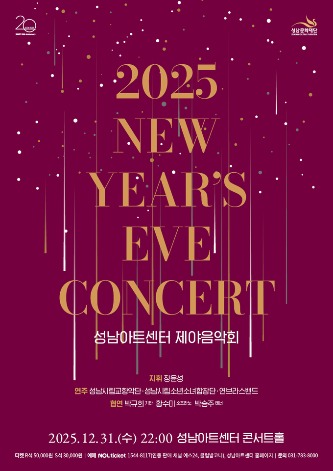 2025년의 마지막 밤은 음악이 전하는 감동과 함께 보내는 건 어떨까. 연말 시즌 성남아트센터의 스테디셀러 공연 ‘성남아트센터 제야음악회’가 올해도 어김없이 12월 31일(수) 성남아트센터 콘서트홀에서 열린다. 장윤성이 지휘하는 성남시립교향악단과 세계적인 클래식 기타리스트 박규희, 소프라노 황수미, 테너 박승주가 특별한 순간을 함께한다. 특히 올해는 관객과 함께 새해를 맞이하는 카운트다운 행사도 예정되어 있다.