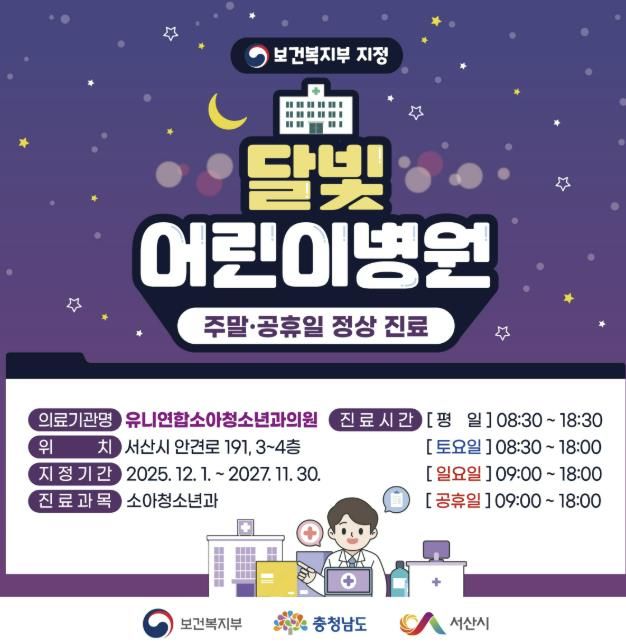 (중부시사신문) 충남 서산시는 동문동에 있는 유니연합소아청소년과의원이 관내 1호 달빛어린이병원으로 지정됐다고 밝혔다.