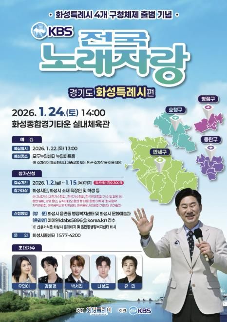 (중부시사신문) 화성특례시는 다음 달 2일부터 15일까지 ‘KBS 전국노래자랑’ 화성특례시편 참가자를 모집한다고 24일 밝혔다.