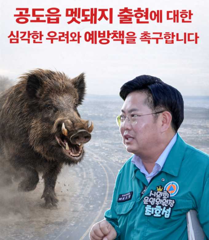 안성시의회 최호섭 의원, 최근 안성시 공도읍 주거 밀집지역 인근에서 멧돼지가 출현하면서 시민들의 불안이 커지고 있다. 아파트 단지와 생활권 인접 지역, 특히 아침 시간대에 확인된 이번 출현은 단순한 야생동물 목격을 넘어 시민 안전 문제로 이어질 수 있다는 우려가 제기되고 있다.