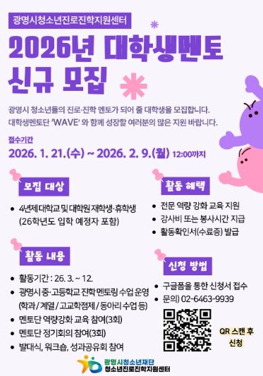 (중부시사신문) 광명시청소년재단 청소년진로진학지원센터는 관내 중·고등학교 청소년 대상 학과 멘토링 운영을 위해 ‘2026년 대학생 멘토단(wave)’을 모집한다고 밝혔다.