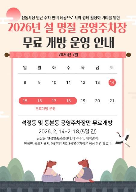 (중부시사신문) 안성시시설관리공단은 2026년 설 명절을 맞아 2월 14일부터 18일까지 5일간, 공단이 관리하는 공영주차장 중 전통시장 인근에 위치한 석정동 공영주차장과 동본동 공영주차장을 한시적으로 무료 개방한다고 밝혔다.