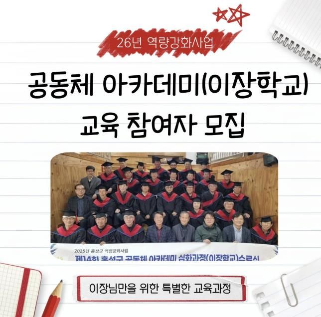 (중부시사신문) 홍성군 마을만들기지원센터는 마을 운영과 의사결정의 핵심 주체인 마을리더의 역량 강화를 위해 공동체 아카데미 심화과정 ‘이장학교’ 참여자를 모집한다.
