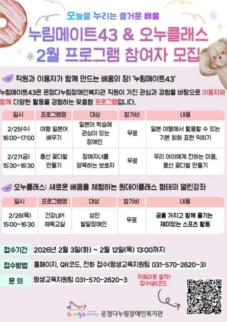 (중부시사신문) 파주시 운정다누림장애인복지관은 참여형 평생학습 프로그램 ‘누림메이트43’을 운영하며, 정규 강좌로는 담기 어려운 소규모 학습 수요를 반영한 생활 밀착형 배움을 실천하고 있다.