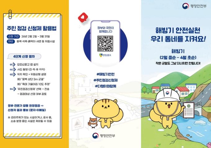시 관계자는 "해빙기에는 옹벽과 석축, 사면 등에서 안전사고 위험이 커진다"라며 "생활 주변에 위험이 우려되는 시설물이 있으면 주민점검신청제를 적극적으로 활용해 주길 바란다"라고 말했다.