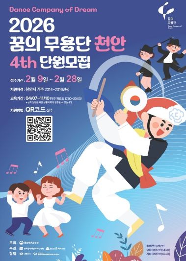 (중부시사신문) 천안문화재단이 지역 아동의 예술적 감수성과 협업 역량을 키우는 ‘2026 꿈의 무용단 천안’ 단원을 9일부터 28일까지 모집한다.