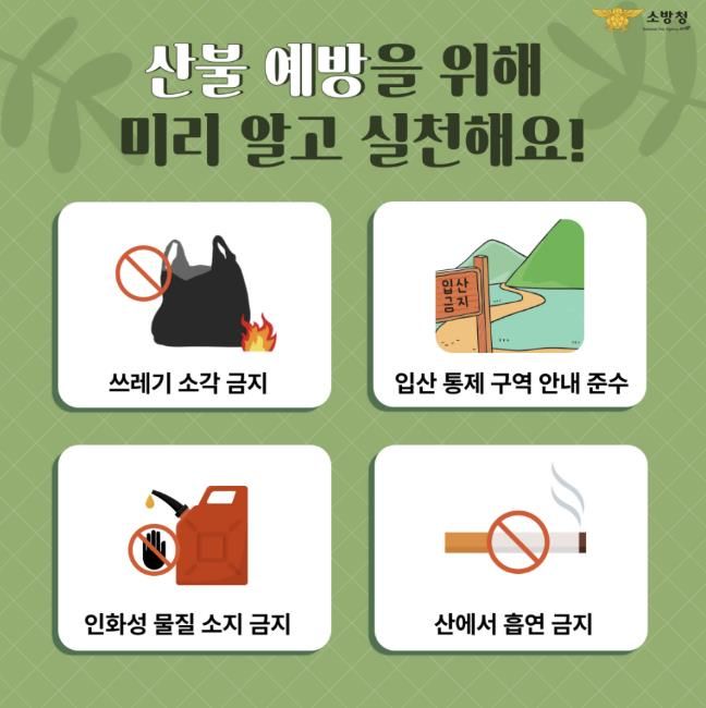 주요 산불 예방 수칙으로는 ▲산림 인접 지역에서 논·밭두렁 및 쓰레기 소각 금지 ▲등산 시 인화물질 소지 금지 ▲담배꽁초 무단 투기 금지 ▲산불 발견 시 즉시 119 신고 등이 있다.