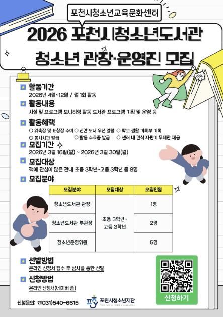 (중부시사신문) 포천시청소년재단 포천시청소년교육문화센터는 청소년 참여형 도서관 운영을 위해 ‘2026년 포천시청소년도서관 청소년 관장 및 운영진’을 모집한다.