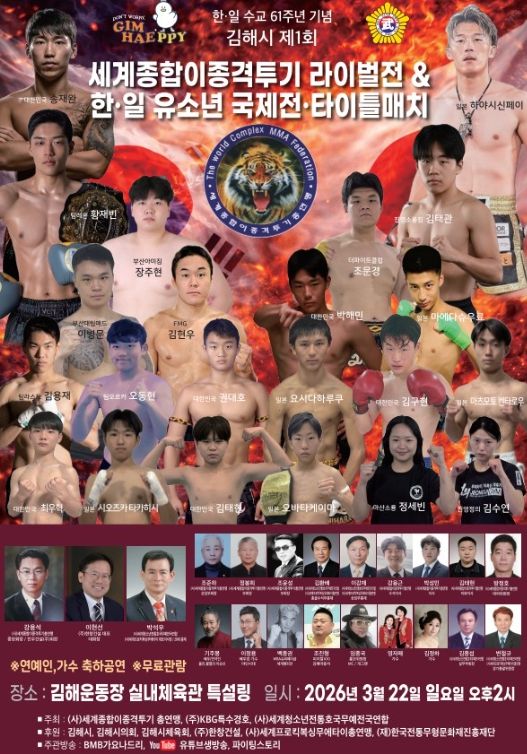 사단법인 세계종합이종격투기총연맹(회장 강용석)과 사단법인 세계청소년전통호국무예전국연합(대표 박석우)이 공동 주최·주관하는 이번 대회는 한국 선수 16명과 일본 선수 6명 등 총 22명의 선수가 참가해 다양한 체급의 경기를 펼친다.