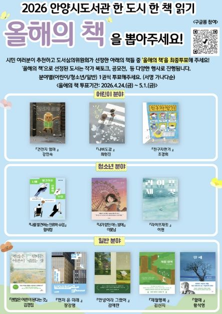 (중부시사신문) 안양시는 2026년 한 도시 한 책 읽기 ‘올해의 책’ 선정을 위한 시민 선호도 조사를 오는 5월 1일까지 온·오프라인으로 진행한다고 24일 밝혔다.