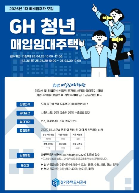 (중부시사신문) 경기주택도시공사(GH)가 청년층 주거 부담을 덜고 안정적인 생활 기반을 마련할 수 있도록 청년 및 자립준비 청년을 위한 매입임대주택 예비입주자 396명을 모집한다고 27일 밝혔다.