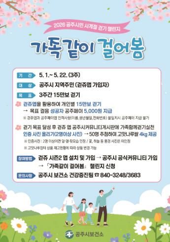 또한 목표 걸음 수를 달성한 참여자 가운데 ‘걷쥬’ 앱 커뉴니티 게시판에 ‘가족과 함께 걷는 인증 사진’을 올린 시민 중 50명을 추첨해 공주 대표 농산물인 고맛나루쌀(4kg)을 제공할 계획이다.