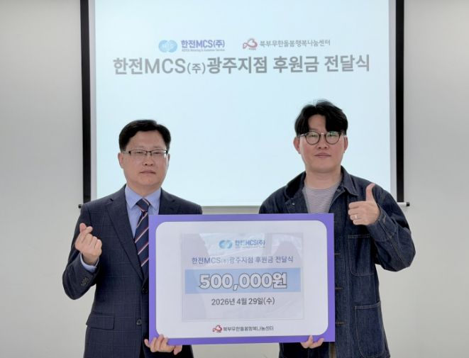 한전MCS 광주지점은 지난 29일 광주시 북부 무한돌봄 행복나눔센터에 후원금 50만 원을 기탁했다. 이번 후원금은 소속 직원들이 자발적으로 모금해 마련한 것으로 의미를 더했다.