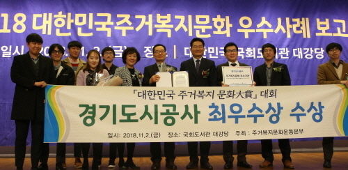 경기도시공사가 지난 2일 국회도서관 대강당에서 열린 ‘제1회 대한민국 주거복지문화대상’에서 최우수상(기관 부문)을 수상했다고 4일 밝혔다.