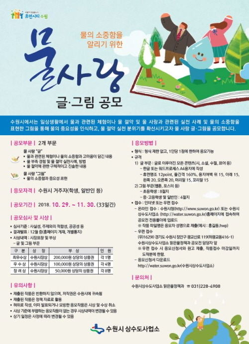 수원시상수도사업소는 이번 달 30일까지 물의 소중함을 알리기 위한 ‘물 사랑 글·그림’을 공모한다.