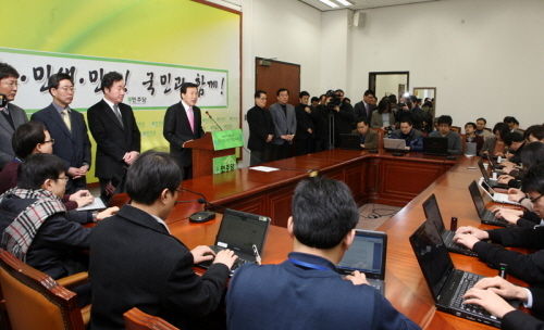 손 대표는 "2월 국회는 민생 국회로 구제역 창궐 진상규명, 서민복지예산 및 경제대책 마련, 남북관계 회복 대책 강구, 친수구역특별법, 서울대 법인화법 재논의, 아랍에미리트(UAE) 파병 위법성, 한미 자유무역협정(FTA) 저지 및 한 EU FTA 점검 등을 주요 의제로 중점 대처할 것"이라고 말했다.