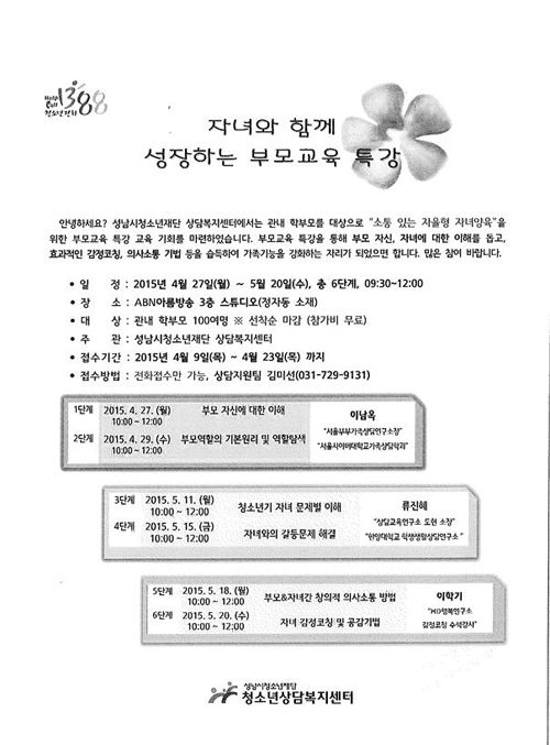 특강은 4월 27일(월) ~ 5월 20일(수) 정자동 아름방송에서 녹화방송으로 진행된다. 참석을 원하는 관내 학부모는 23일(목)까지 전화로 신청하면 된다. 정원은 선착순 100명이며 참가비는 무료이다.