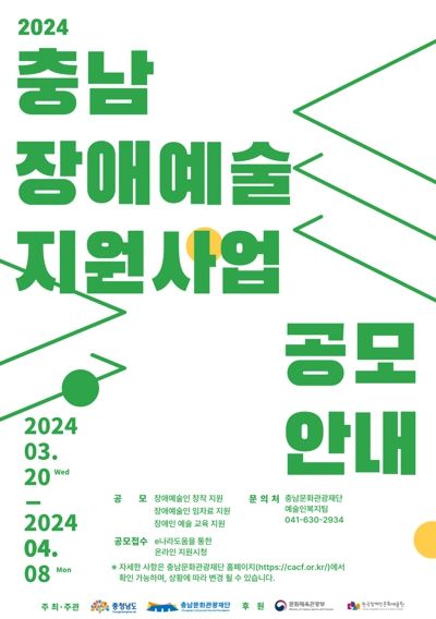 도와 (재)충남문화관광재단이 추진하는 이번 공모는 장애인 예술교육 기관의 운영지원 및 장애예술인(단체)에게 창작·임차료 등을 지원하는 사업이다.