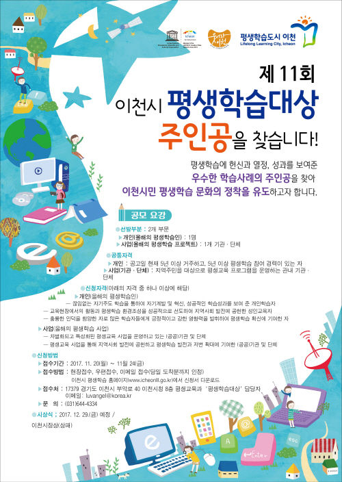 접수기간은 11. 20(월)부터 11. 24(금)까지로, 신청서는 이천시 평생학습 홈페이지(www.icheonlll.go.kr)에서 다운로드할 수 있다. 한편, 평생학습대상은 2017년 종무식에서 시상할 예정이다.