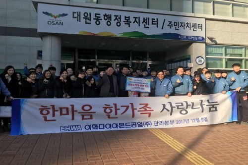 오산시 대원동 행정복지센터(동장 김경만)는 지난 9일 이화다이아몬드공업(주)으로부터 사랑의 쌀 400kg과 연탄 1600장 및 이화다이아몬드공업 노·사 측으로부터 쌀 800kg, 라면 20박스, 선물세트 20개를 기탁 받았다고 밝혔다.