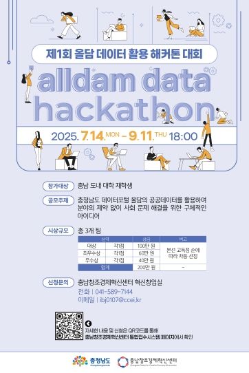 충남혁신센터 관계자는 “충남 데이터포털 ‘올담’의 활용도와 공개된 충남 데이터에 대한 관심 높일 수 있는 기회”라며 “사회 문제 해결에 관심이 있는 창의적인 도내 대학생의 관심과 참여를 바란다”라고 전했다.