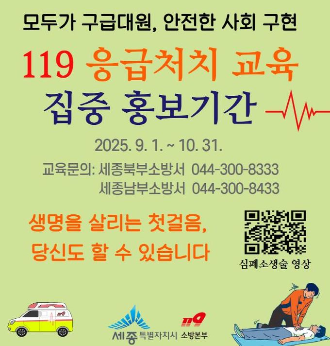 (중부시사신문) 세종소방본부가 오는 10월 31일까지 시민들의 응급처치 능력을 높이고, 안전문화를 확산하기 위해 119 응급처치 집중 홍보기간을 운영한다.