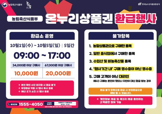 농림축산식품부가 주관하는 이번 행사는 행사 참여 전통시장에서 국산 신선 농축산물을 구매한 소비자에게 구매 금액의 최대 30%를 온누리상품권으로 환급하는 방식으로 운영된다.
