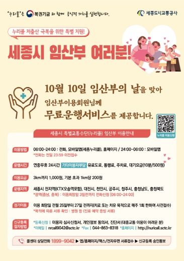 (중부시사신문) 세종도시교통공사는 오는 10월 10일 ‘임산부의 날’을 맞아 이날 하루 특별교통수단 누리콜 차량을 무료로 운행한다고 밝혔다.