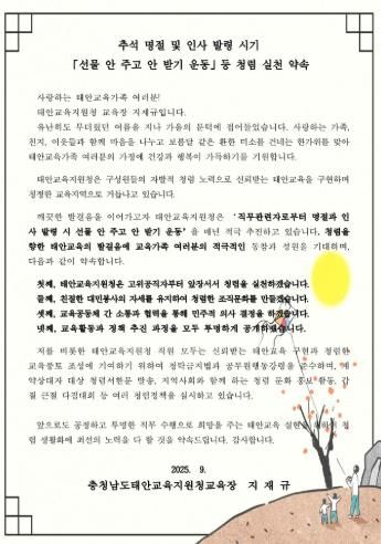 (중부시사신문) 충청남도태안교육지원청은 추석 연휴 시기를 맞아 청렴한 공직문화를 확산하기 위해 ‘선물 안 주고 안 받기 운동’을 강조하는 청렴 서한문을 홈페이지에 게시했다.