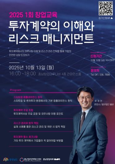 교육은 2025년 10월 13일 충남창업마루나비에서 진행되며, 류재언 변호사(법무법인 율본)가 강사로 참여해 스타트업 컴플라이언스 원칙, 투자계약 주요 조항, 리스크 관리 및 법적 책임, 투자계약 필수 체크사항 등을 상세히 강의할 예정이다.