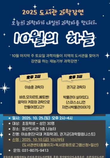 (중부시사신문) 고양특례시 일산도서관에서는 과학자들의 재능기부 도서관 과학 강연프로그램 ‘10월의 하늘’을 운영한다.