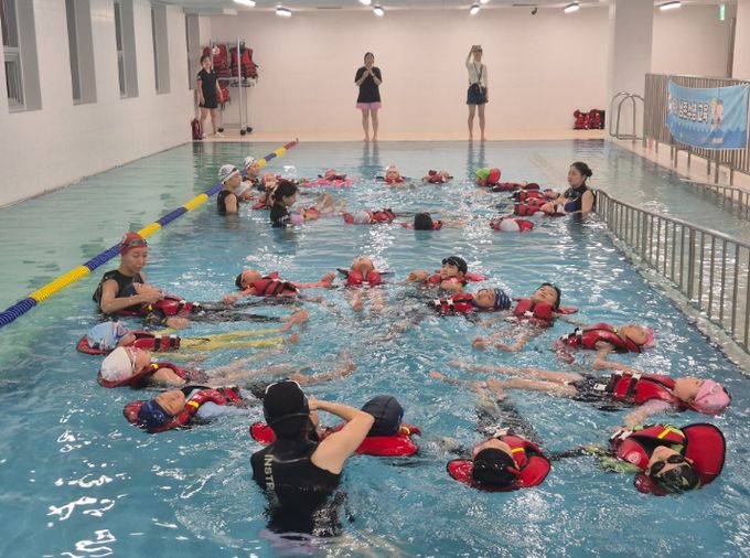 교육의 내용은 △수영장 안전수칙 전달 및 준비운동 △구명조끼 착용 방법 △안전하게 입수/퇴수 연습하기 △다양하게 이동해보기 △호흡 및 잠수 △단계별 기초 발차기 △구명조끼 뜨기 등의 1일차 교육과 △친구와 같이 이동하기 △릴레이 발차기 △구명조끼 뜨기로 오래 버티기 △이함 및 단체 생존 △탈출 시뮬레이션의 2일차 교육으로 진행됐다.
