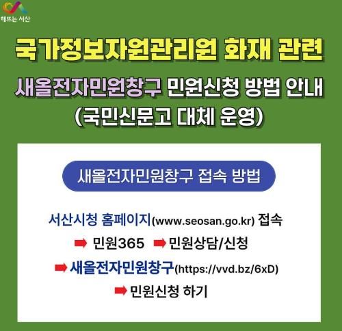 긴급 가동되는 새올전자민원창구를 통한 민원 접수는 서산시 누리집에서 할 수 있으며, 건의·질의·고충 등 각종 민원을 접수할 수 있다.