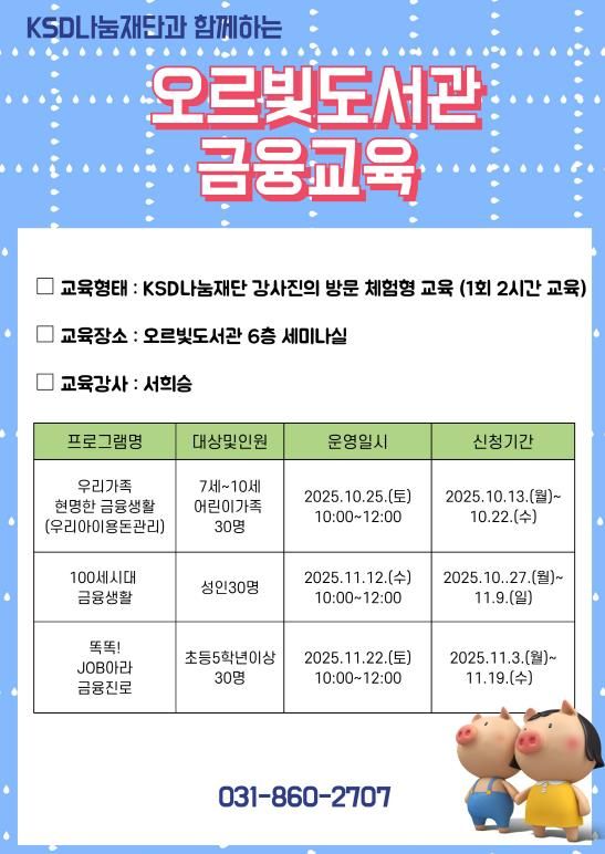 (중부시사신문) 동두천시 도서문화사업소는 KSD나눔재단과 함께 10월 25일부터 11월 22일까지 오르빛도서관 6층 세미나실에서 세대별 맞춤형 금융교육 프로그램을 운영한다.