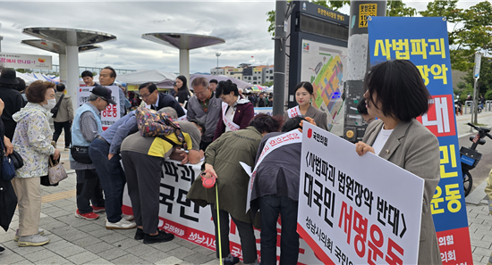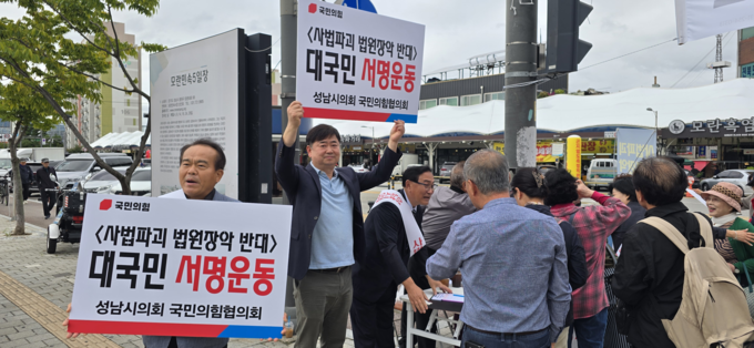 성남성남시의회 국민의힘협의회(대표의원 정용한)는 10월 14일(월) 오후 2시, 성남 모란시장에서「사법파괴·법원장악 반대 대국민 서명운동」을 성황리에 실시했다.
