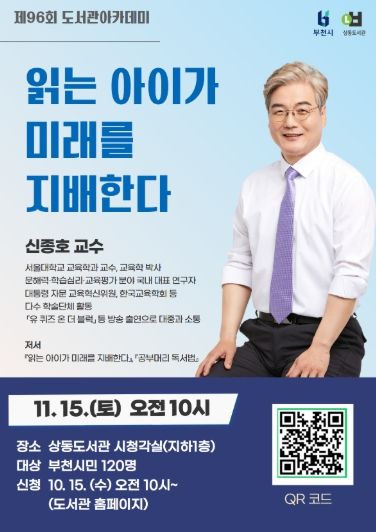 (중부시사신문) 부천시는 11월 15일 오전 10시 부천시립상동도서관 시청각실에서 인공지능(AI)·디지털 시대 학습 경쟁력의 핵심인 문해력을 주제로 ‘제96회 도서관 아카데미’를 연다. 이번 강연은 ‘읽는 아이가 미래를 지배한다’의 저자이자 서울대학교 교육학과 교수인 신종호 교수를 초청해 진행한다.