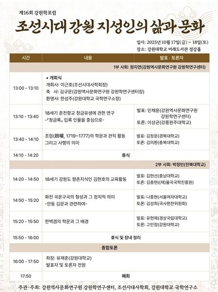 (중부시사신문) 강원역사문화연구원 강원학연구센터는 2025년 10월 17일 오후 1시, 강원대학교 미래도서관 정강홀에서 제16회 강원학포럼 ‘조선시대 강원 지성인의 삶과 문화’를 조선시대사학회·강원대학교 국학연구소와 공동으로 개최한다.