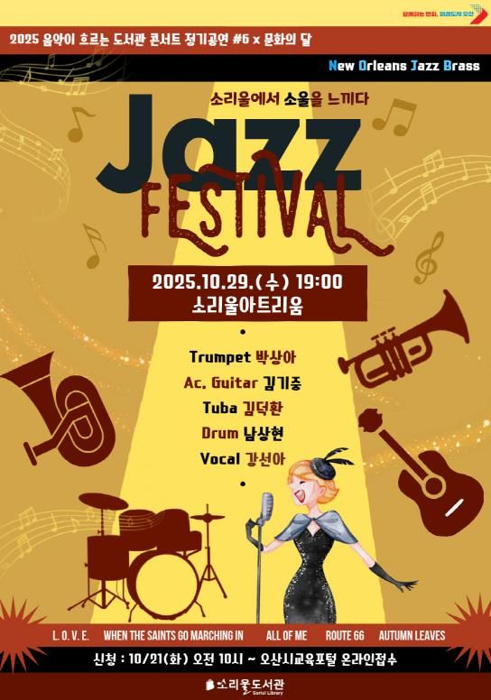 (중부시사신문) 경기도 오산시는 오는 10월 29일 오후 7시, 소리울도서관 3층 소리울아트리움에서 '2025 음악이 흐르는 도서관 콘서트 정기공연 #6 × 문화의 달 – Jazz Festival; 소리울에서 소울을 느끼다'를 개최한다고 밝혔다.