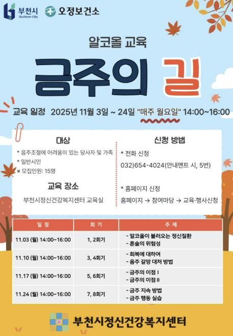 (중부시사신문) 부천시는 부천시정신건강복지센터와 함께 알코올 문제로 어려움을 겪는 시민의 회복을 지원하기 위해 11월 3일부터 11월 24일까지 매주 월요일 오후 2시부터 4시까지 ‘금주의 길’ 프로그램을 운영한다.