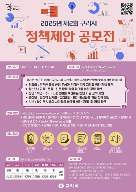 (중부시사신문) 구리시는 오는 11월 3일부터 11월 23일까지'2025년 제2회 구리시 정책 제안 공모전'을 개최한다고 밝혔다. 이번 공모전의 주제는 ‘구리 시민(영유아·청소년·청년·중장년·노년) 나이별 맞춤형 정책 아이디어’다.
