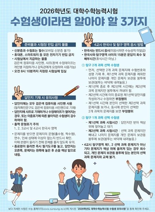 (중부시사신문) 세종특별자치시교육청은 11월 13일에 실시되는 2026학년도 대학수학능력시험을 수험생들이 안정적으로 치를 수 있도록 ‘수험생 유의사항’을 안내했다.